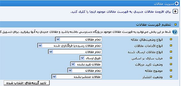 در این صفحه به فهرست مقالات منتشر نشده در پایگاه دسترسی می‌یابید. شما می‌توانید مقالات را به شیوه‌های مختلفی دسته‌بندی کنید. برپایه‌ی: وضعیت‌ مقاله، اقدامات انجام شده روی مقاله، تاریخ ارسال، موضوع مقاله یا وضعیت انتشار. از همین صفحه می‌توانید مقاله‌ی جدید نیز به برنامه وارد کنید.
