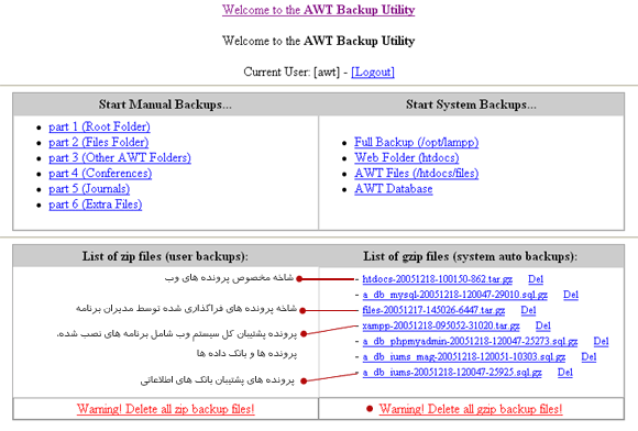 به یاد داشته باشید: شما به عنوان مدیر ارشد پایگاه میتوانید از ماژول تهیهی پشتیبان از بانک دادهها (واقع در فهرست مدیریت) برای ایجاد و دریافت پشتیبان از بانک اطلاعاتی استفاده کنید. همچنین میتوانید برای پشتیبانگیری از هر یک از پوشههای موجود در شاخهی files از ماژول پوشهها و فایلها (واقع در فهرست مدیریت) استفاده کنید. اما اگر حجم دادههای شما بسیار بالا باشد بهتر است از ابزار AWT_BU برای انجام اینکار بهره ببرید.