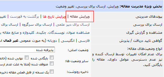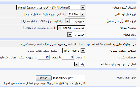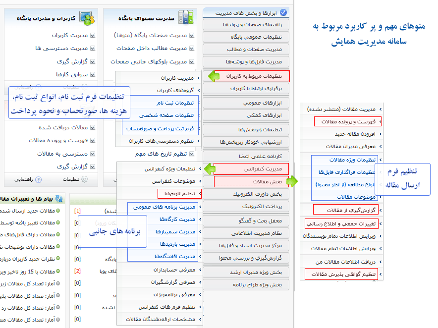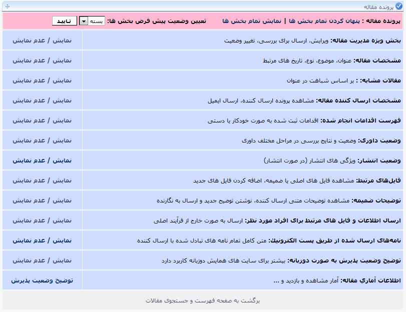 | بخش مقالات | تنظیمات ویژه مقالات | تنظیم کادرها و امکانات فعال در فرم ارسال مقاله، ارسال ایمیل به کاربر، مراحل بررسی مقالات، وضعیت های مقالات، فایل های اصلی فعال برای ارسال و توضیحات کادرهای ارسال فایل، |