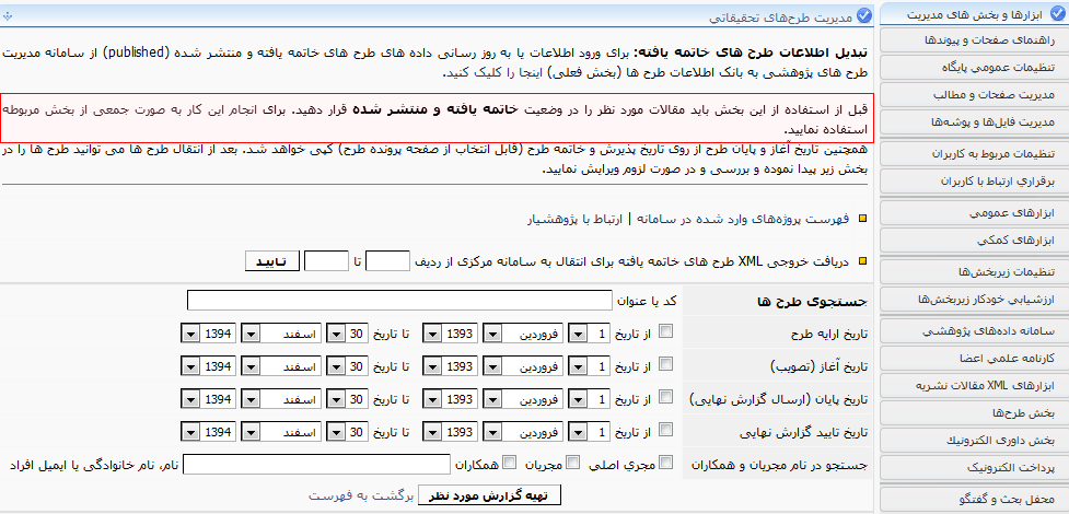 همچنین می توانید از سامانه داده های پژوهشی استفاده کنید و طرح های پذیرفته شده را به صورت خودکار در آن وارد کنید. برای این کار ابتدا طرح های مورد نظر را در وضعیت "پذیرش نهایی" قرار دهید. سپس به بخش مربوطه در سامانه داده ها وارد شده و از لینک های بالای صفحه برای انتشار این طرح ها استفاده کنید.