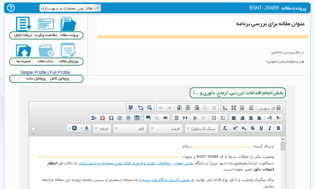 کارشناس بررسی وضعیت داوری ها و ارسال برای سردبیر در صورت اتمام کار داوران: در انتظار جمع‌بندی داوری توسط سردبیر