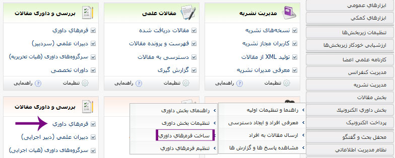 منظور از فرمهای داوری، هر نوع فرم بخش داوری از جمله فرم دبیر علمی، فرم داوری، فرم معرفی داور و هر فرم دیگری است که برای داوری مقالات به آن نیاز هست. این فرمها را با کمک سامانهی مدیریت اطلاعات شرکت یکتاوب میتوانید بسازید.