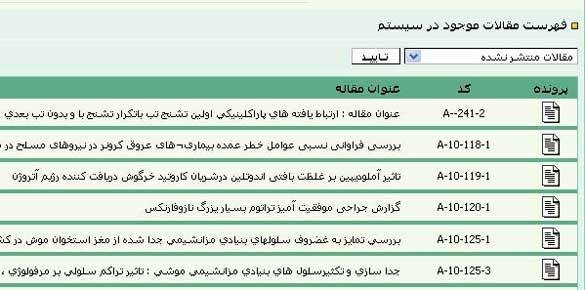 کد مقاله، عنوان مقاله، موضوع مقاله، نوع مقاله، تاریخ ارسال و فرستندهی مقاله را میبینید. شما میتوانید با فرستادن پست الکترونیک به فرستندهی مقاله، او را از وضعیت مقاله آگاه سازید. همچنین، مدیر پایگاه میتواند با توجه به خواست سردبیر ، وضعیت مقاله را تغییر دهد.