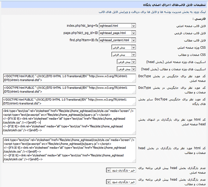 3. قالبهای سفارشی قالبهای ویژه به سفارش کارفرما و به صورت اختصاصی برای هر یک از پایگاهها تهیه میشوند. این نوع قالبها از ترکیب یک صفحه HTML یا TPL با کدهای قالب یکتاوب فراهم میآیند. فایلهای HTML یا TPL این نوع قالب در شاخه yekta_program/tpl_files قرار میگیرند. هر نوع فایل css یا js اضافی را هم می توانید با اضافه کردن کدهای مورد نظر در کادرهای موجود در این بخش (بخصوص کادری که محتوای آن در بخش head بارگذاری می شود) در قالب سفارشی خود فراخوانی کنید. مثلا یک پوشه در site1 بسازید و کلیه css ها و js ها را در آن قرار دهید و سپس در این کادر این نشانی ها را به صورت زیر وارد کنید: <link type="text/css" rel="stylesheet" href="files/site1/new_template/css/style.css" media="screen" />
