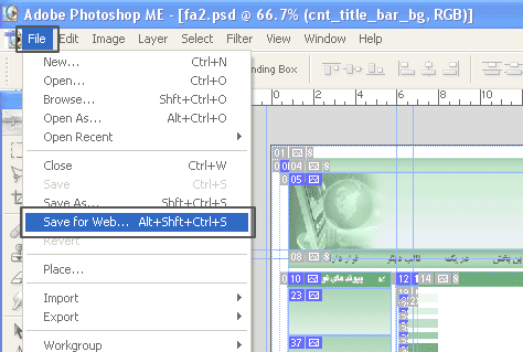 پس از پایان ویرایش قالبها میتوانید آنها را به روش زیر برای استفاده در برنامه آماده کنید: مرحله اول: اجرای دستور ذخیره فایل برای وب