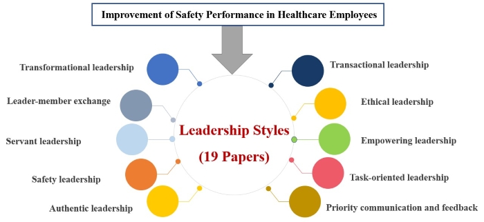 Results: Nineteen relevant papers were selected and included in the study. During the review of studies, eleven leadership styles or approaches were identified in relation to safety performance in various healthcare facilities. These included transformational leadership, leader-member exchange leadership, leader safety priority communication and feedback, ethical leadership, empowering leadership, inconsistent and destructive leadership, transactional leadership, task-oriented leadership, authentic leadership, safety leadership, and servant leadership. All leadership styles except for inconsistent and destructive leadership had a direct or indirect positive effect on safety performance. Also, the largest number of studies (n=4) focused on transformational leadership style and leader-member exchange leadership.