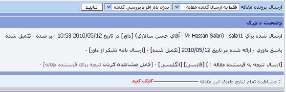 گزارش وضعیت داوری را میبینید. میتوانید نامهی سپاسگذاری به داور بفرستید. نتیجه را به زبان فارسی یا انگلیسی برای فرستندهی مقاله بفرستید. میتوانید نتیجهی داوری را برای فرستندهی مقاله قابل مشاهده کنید تا آن را در صفحهی شخصی خود در پایگاه مجله ببیند. همچنین میتوانید همهی نتایج داوری را در یک صفحه ببینید.